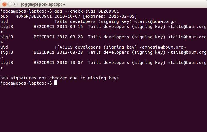 Note the last line which warns us that: "308 signatures not checked due to missing keys". These missing keys are those of the Debian Developers and others for whom you have no public keys in your keyring. You can download the Debian keys from the Ubuntu Software Center (search for debian-keyring) or with: